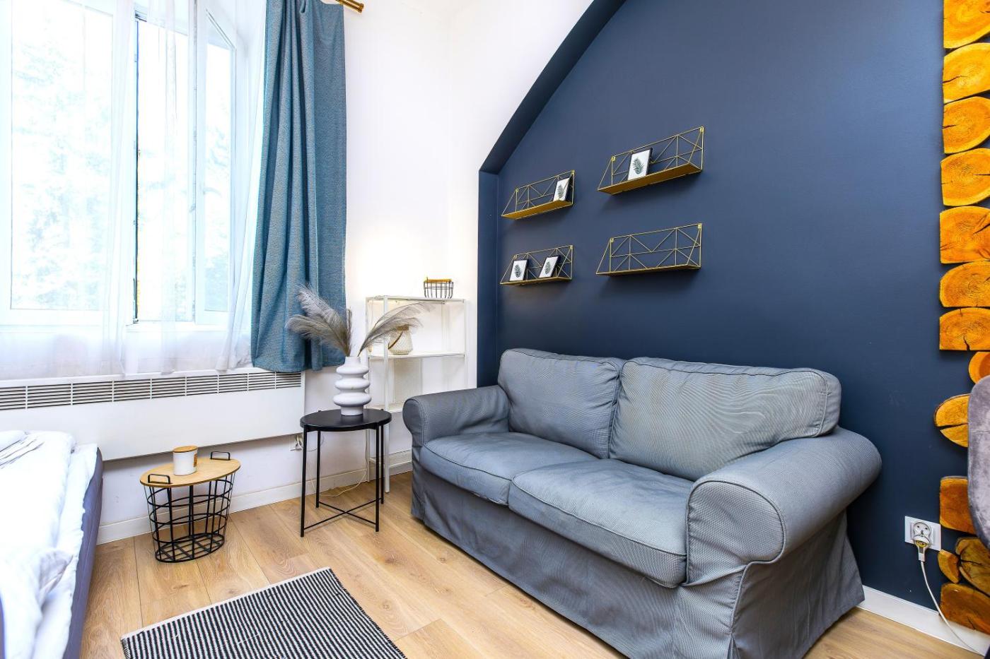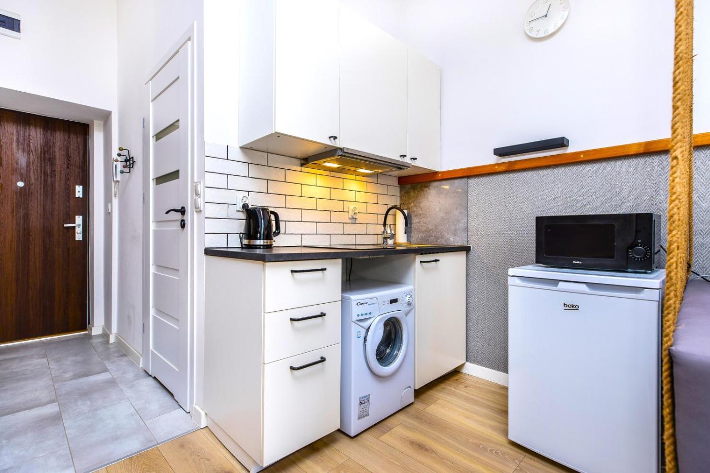 Apartament typu studio z łóżkiem podwójnym. Boasting a private entrance, this apartment features a kitchenette, 1 bedroom and 1 bathroom with a shower and a hairdryer. Guests can make meals in the kitchenette that has a stovetop, a refrigerator, kitchenware and a microwave. The apartment features a washing machine, a wardrobe, an electric kettle along with a sofa. The unit has 1 bed. Apartament - 2 osobowy. Powierzchnia pokoju ok.: 24 mkw.