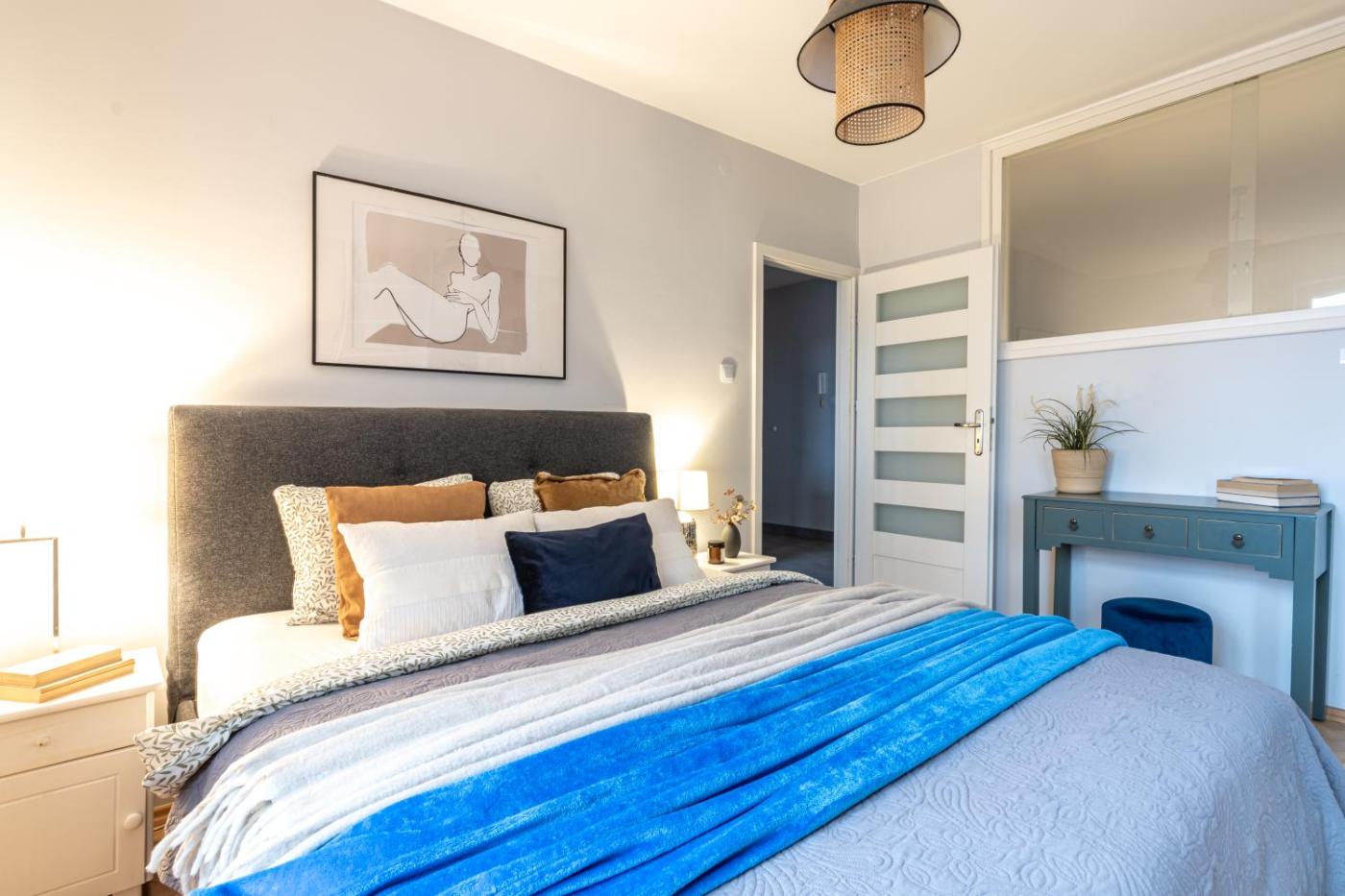 Apartament z 1 sypialnią. This apartment comes with 1 living room, 1 separate bedroom and 1 bathroom with a shower. Meals can be prepared in the kitchen, which features a stovetop, a refrigerator, kitchenware and an oven. The apartment features a flat-screen TV, a washing machine, a tea and coffee maker, a dining area as well as city views. The unit has 2 beds. Apartament - 4 osobowy. Powierzchnia pokoju ok.: 47 mkw.